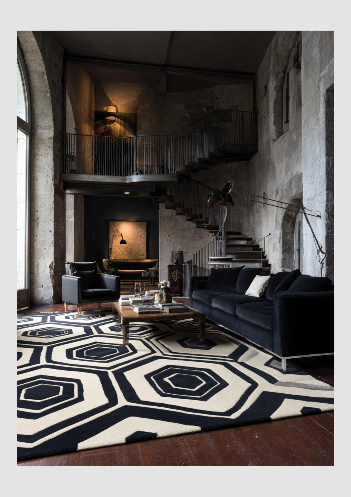 Graphic Rugs: A cream or beige rug with a subtle black geometric pattern ties the whole room together.