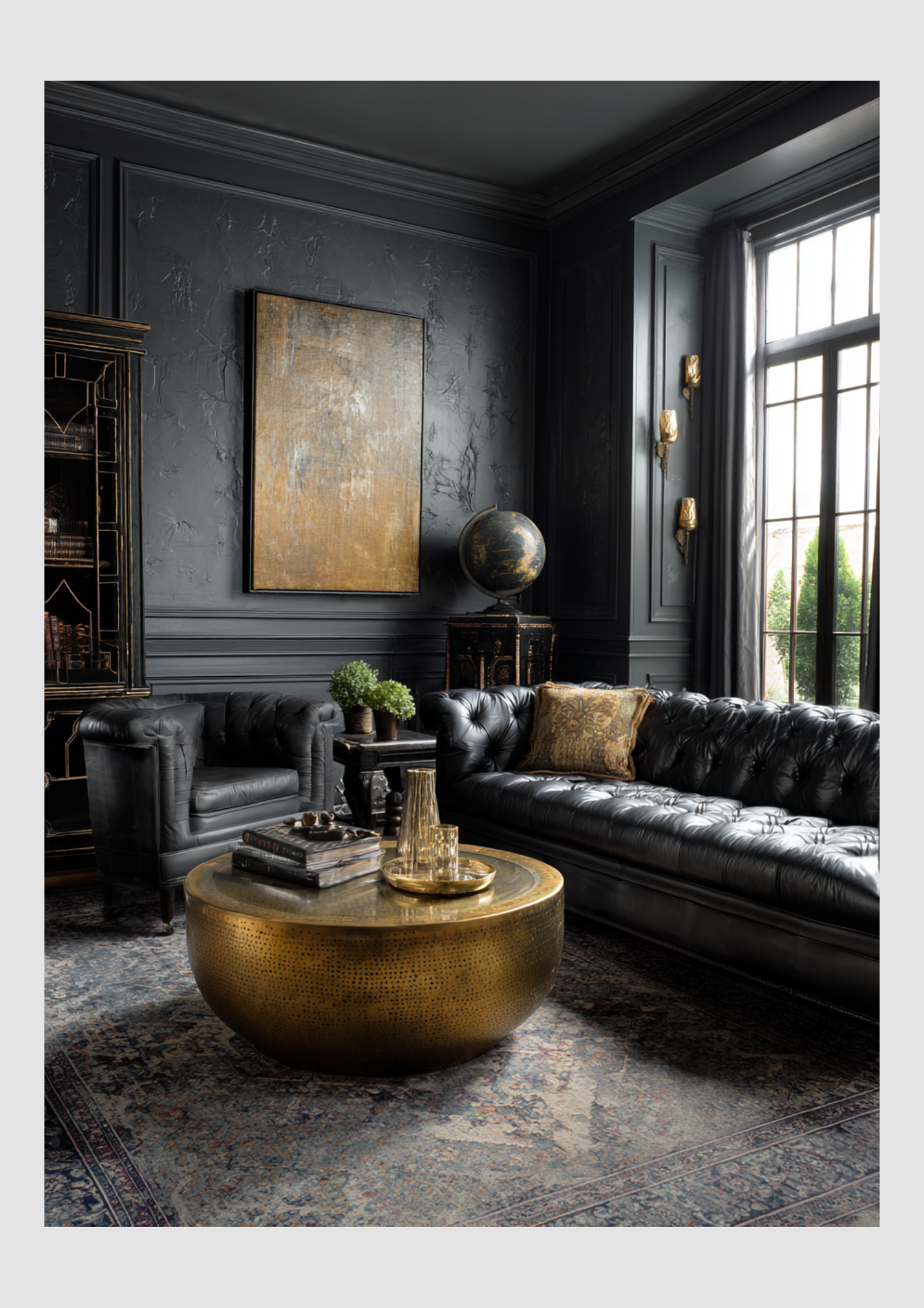 Metallic Gold or Brass: Nothing says "Noir Luxury" like gold accents reflecting against a matte black backdrop.